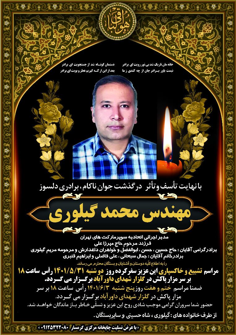 اطلاعیه:اِنّا للّه وَ اِنّا اِلَيْهِ راجِعوُن با نهايت تأسف و تأثر درگذشت ناگهاني همكار گرامی، برادری دلسوز مهندس محمد گیلوری